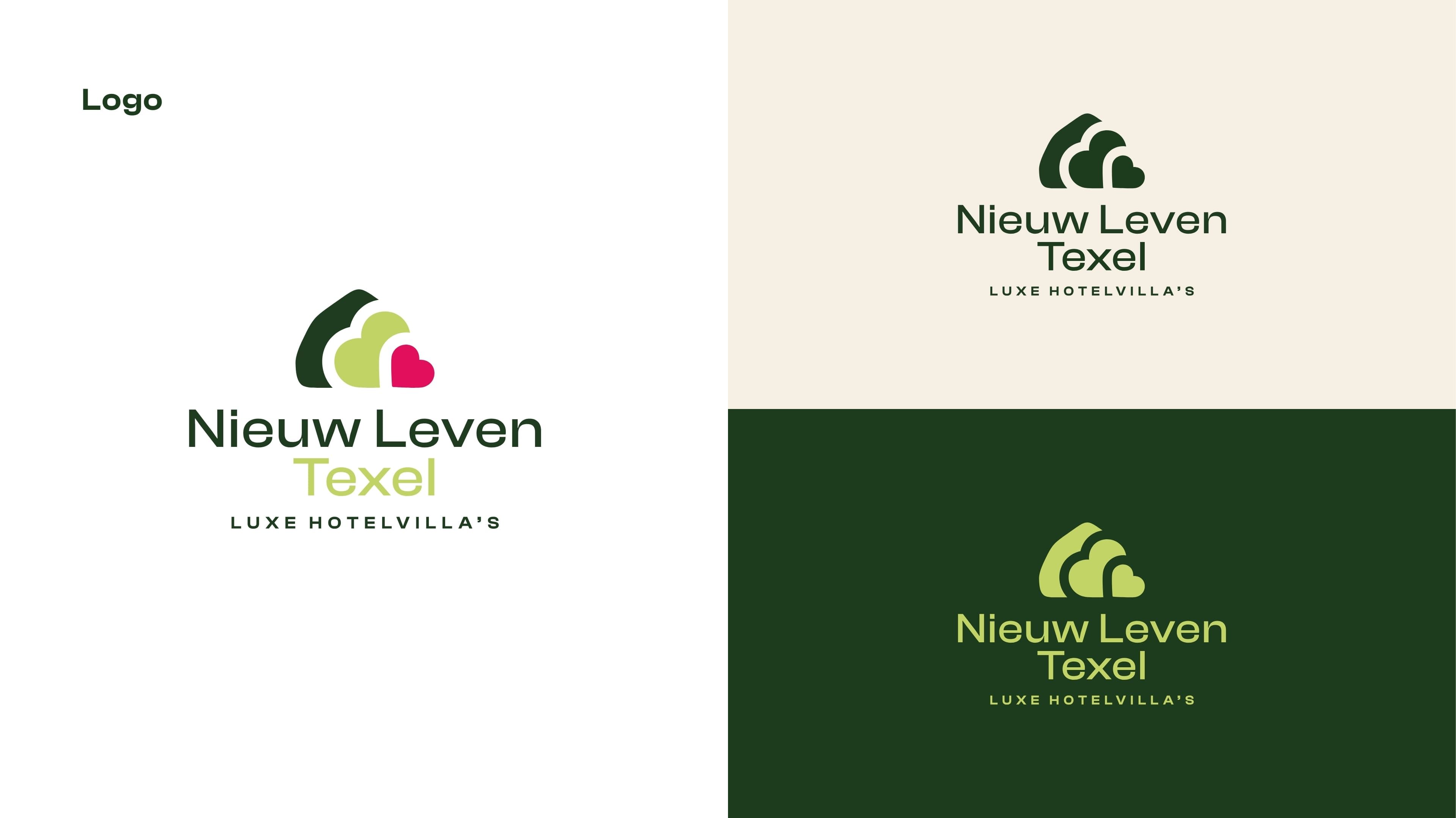 De struik en het hartje hebben dezelfde vorm en zijn gekanteld tegen elkaar geplaatst. Zo ontstaat een spannend icoon. Deze vormen keren terug in de huisstijl en op de website en zorgen voor verrassende doorkijkjes – net als op het terrein van Nieuw Leven Texel zelf.